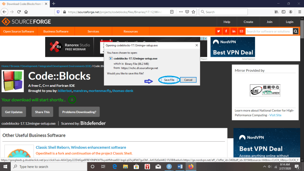 7. Kemudian, setelah muncul tampilan seperti dibawah ini, klik “Save File” untuk menyimpan file codeblocks-17.12mingw-setup.exe.