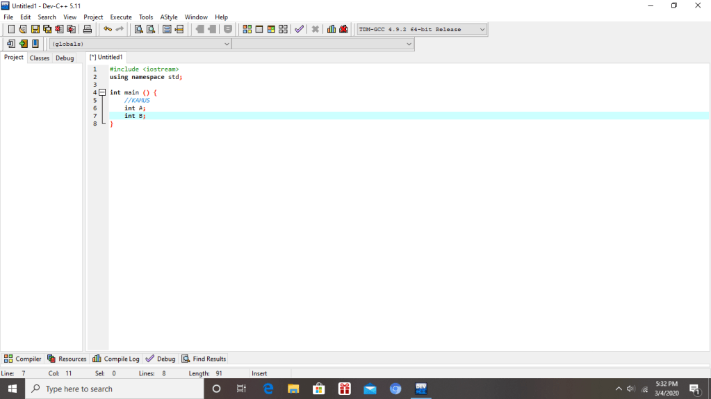 2. Setelah itu, akan muncul tampilan seperti dibawah ini. Lalu pada line 1, ketik “#include <iostream>”