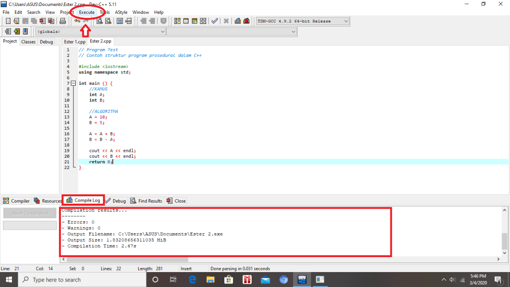 6. Selanjutnya, klik menu “Execute” lalu pilih menu “Compile” untuk menyimpan project kedua yang telah kita buat tadi.