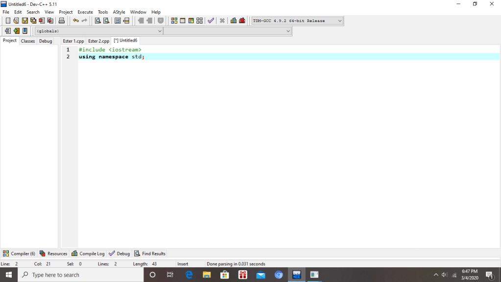 6. Setelah itu, klik enter. Lalu, pada baris line 2, ketik ” using namespace std; “.