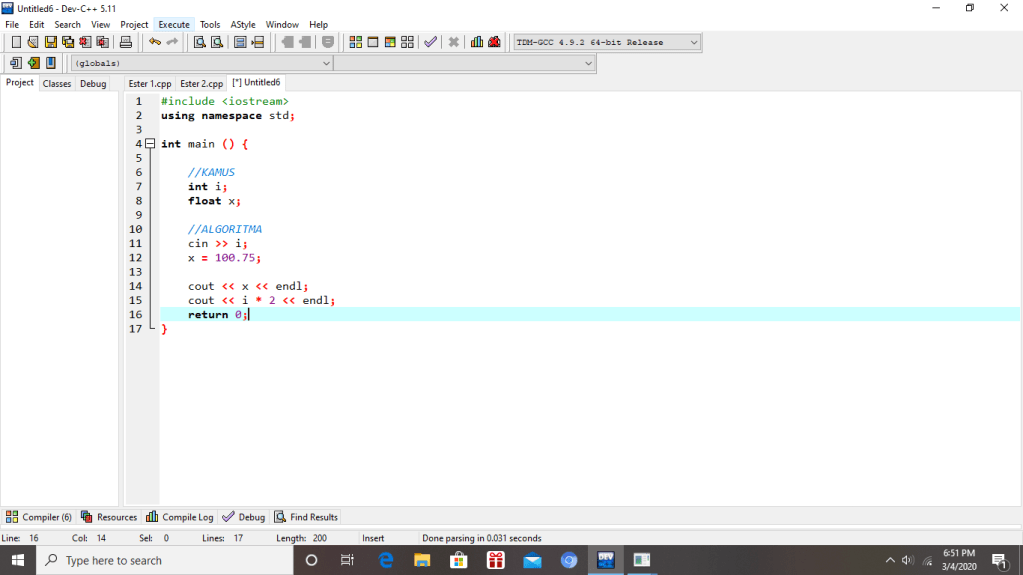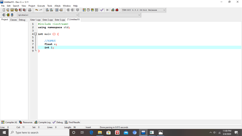 4. Kemudian, pada tahap selanjutnya, kita masuk pada bagain Kamus. Dalam bagian ini, kita dapat mengetik : int main () {