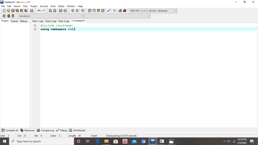 3.Kemudian, ketik “using namespace std;” pada line 2.